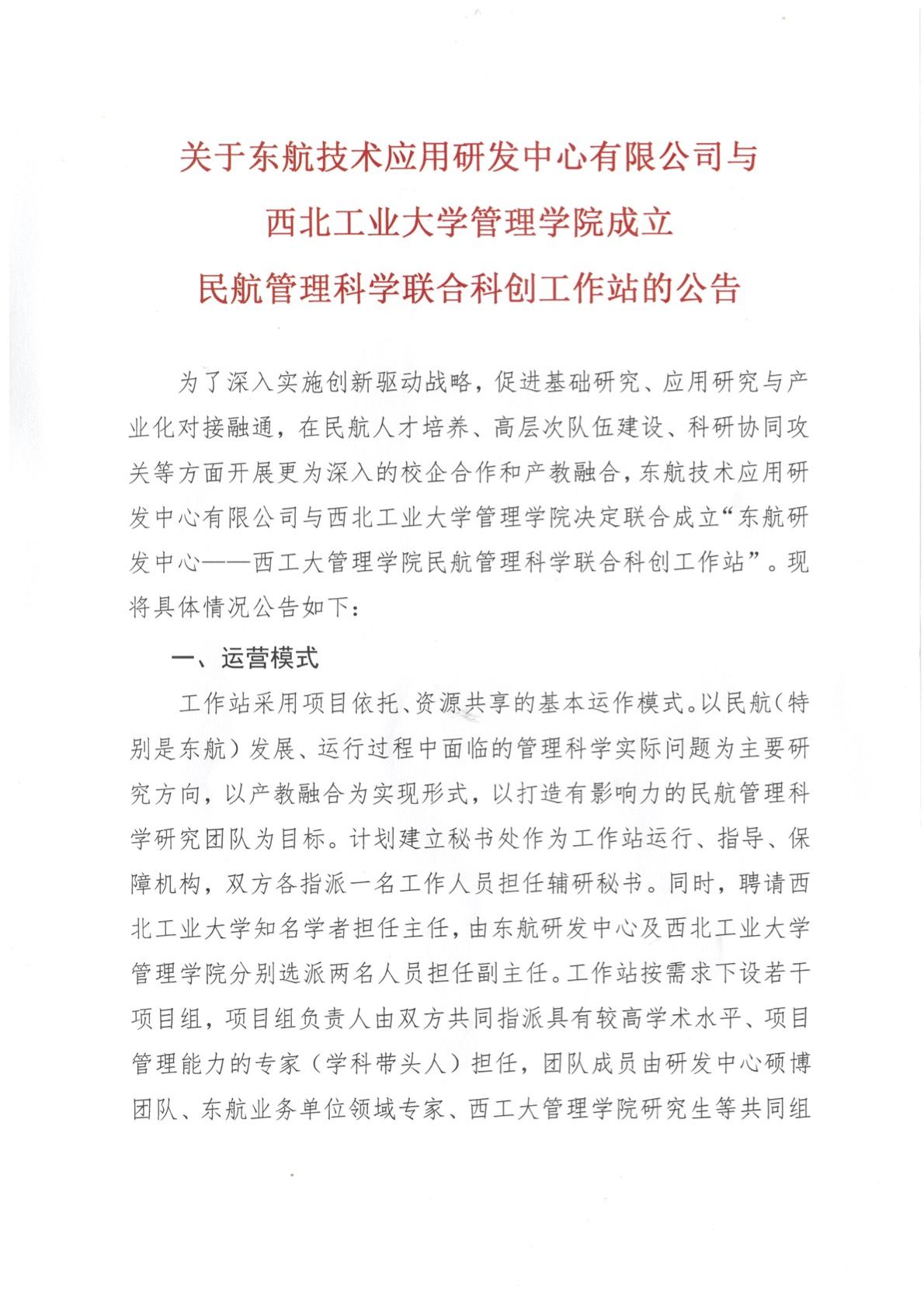 在西北工业大学与东航集团签署战略合作协议框架下,为了配合深入实施创新驱动战略,促进研究与产业化的对接的校企合作和产教对接融通,东航技术应用研发中心有限公司与西北工业大学管理学院联合成立“东航研发中心——西工大管理学院民航管理科学科创工作站”。