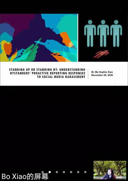 12月28日下午14:00-16:00,管理学院举行建院30周年系列学术报告会第二十六讲。美国夏威夷大学马诺阿分校希德勒商学院的Bo Sophia Xiao副教授应邀为管院师生作了“Standing Up or Standing By: Understanding Bystanders’ Proactive Reporting Responses to Social Media Harassment”线上主题报告会。报告会由董雪艳助理教授主持,管理学院30余师生参加了此次线上报告会。