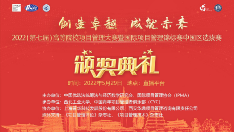 2022年5月28日,由西北工业大学承办的2022年(第七届)高等院校项目管理大赛暨国际项目管理锦标赛中国赛区选拔赛以线上形式成功举办,并于5月29日举行了线上颁奖典礼。