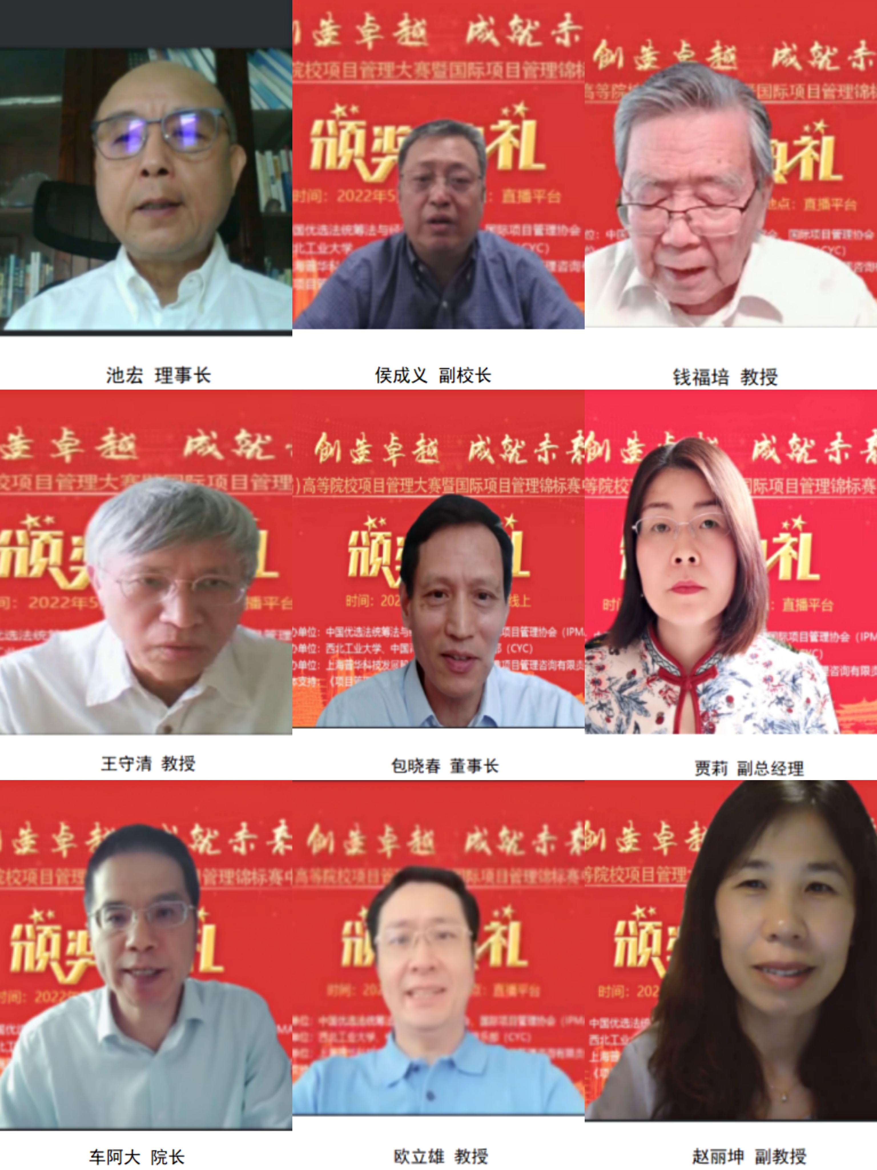 中国优选法统筹法与经济数学研究会理事长、中国科学院科技战略咨询研究院池宏研究员,西北工业大学副校长侯成义研究员,中国优选法统筹法与经济数学研究会项目管理研究委员会名誉主任、西北工业大学钱福培教授,中国优选法统筹法与经济数学研究会项目管理研究委员会副主任、清华大学王守清教授,中国优选法统筹法与经济数学研究会秘书长、中央财经大学林则夫教授,中国优选法统筹法与经济数学研究会项目管理研究委员会副秘书长常淑茶女士,上海普华科技发展股份有限公司包晓春董事长,西安华鼎项目管理咨询有限公司贾莉副总经理等领导和嘉宾出席了大赛颁奖典礼并致辞。中国优选法统筹法与经济数学研究会项目管理研究委员会常务副主任、大赛评审专家委员会主任、西北工业大学欧立雄教授宣布大赛奖励决定,中国青年项目管理者俱乐部(CYC)主席、北方工业大学赵丽坤副教授宣布大赛获奖名单。中国优选法统筹法与经济数学研究会项目管理研究委员会副主任、西北工业大学管理学院院长车阿大教授主持颁奖典礼。项目管理大赛线上颁奖典礼