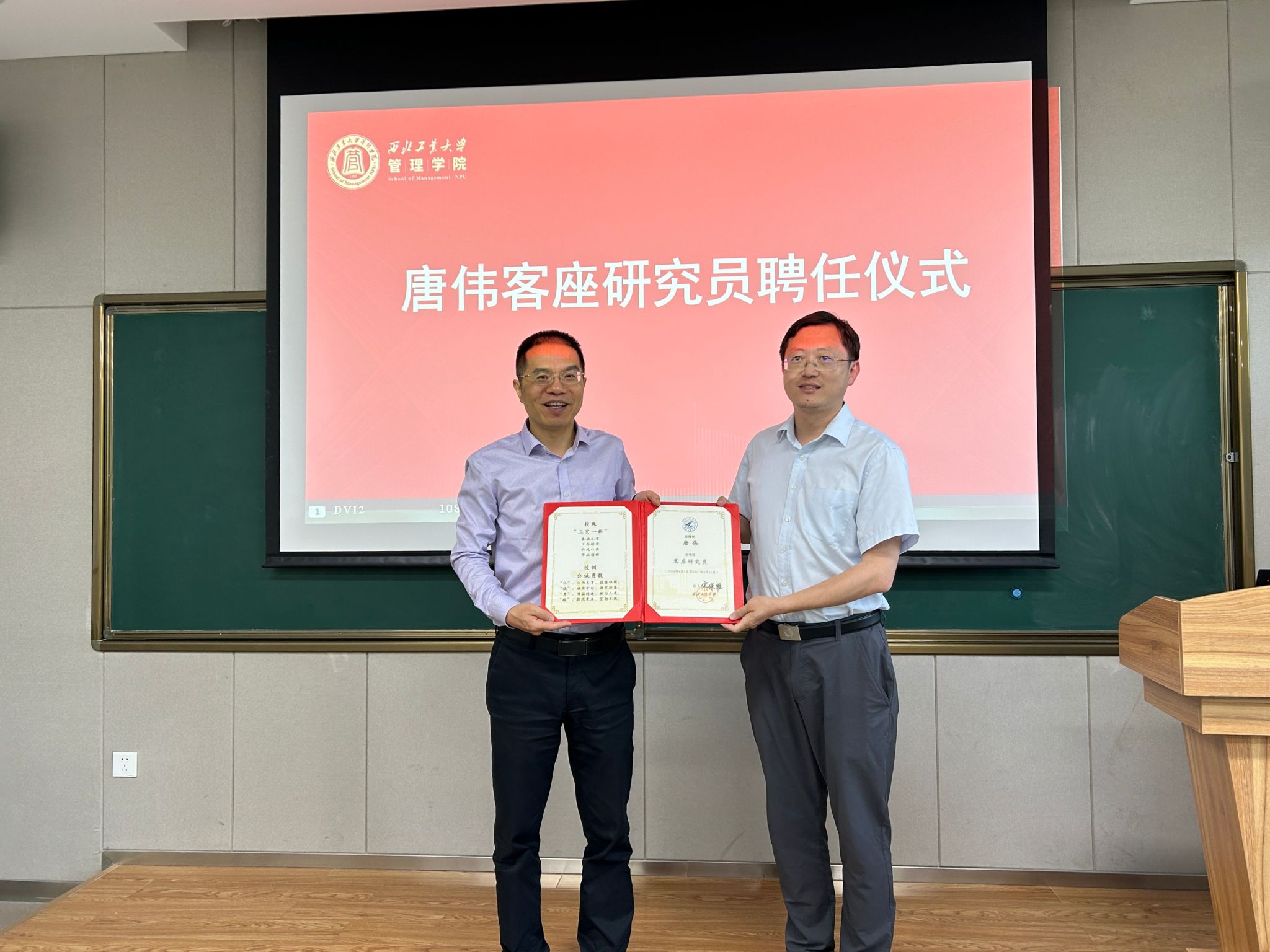 在讲座开始之前,车阿大对唐伟的到来表示热烈欢迎,对其个人经历和学术成就进行简要介绍,并为他颁发客座研究员聘任证书。车阿大表示,唐伟已成为学院的一份子,希望未来在项目申请、科学研究等方面能够助推学院高质量发展。唐伟表示,受聘为西北工业大学客座研究员既是对自身的肯定也是前行的动力,将积极促进校企合作,高质量完成客座研究员的目标任务。
