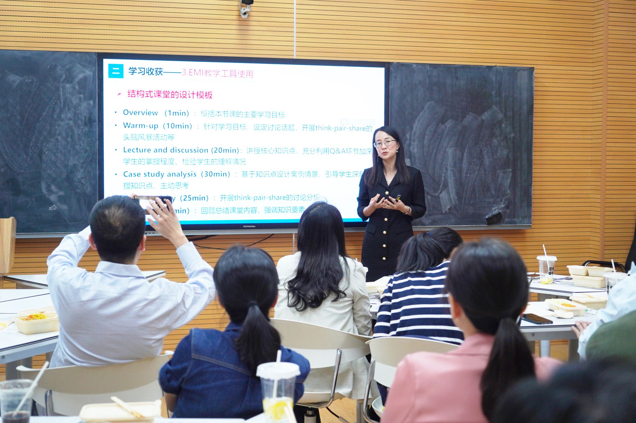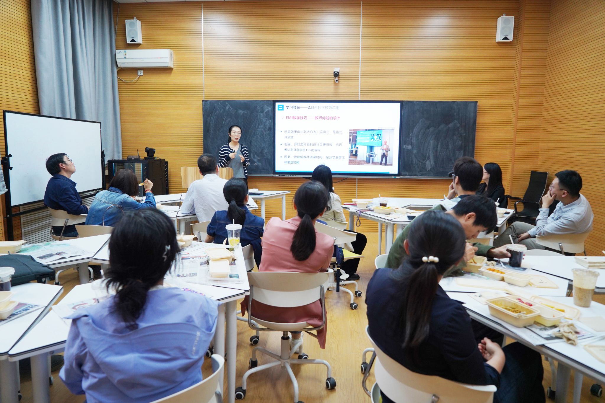董雪艳副教授在报告中介绍了EMI教学工具的使用方法。围绕结构式课堂设计、互动教学工具应用及AI技术与课程深度融合等关键维度,同与会教师全面分享了教学研修的成果。在分享中,她谈到EMI教学法主讲教师通过现场实践督导与即时高效反馈相结合的方式,深入解析教学技巧的实践应用,使此次参训教师受益颇深。她表示,此次教学研修项目不仅深切感受到学校对青年教师教学能力提升的支持及参训教师群体对教育教学的热忱,更从中汲取了丰富的跨文化、跨学科教学经验与创新灵感。作为教学改革践行者,她将持续推进EMI教学理念与课程体系融合,在教学范式转型、育人理念革新及课堂效能提升方面深入展开探索与实践。