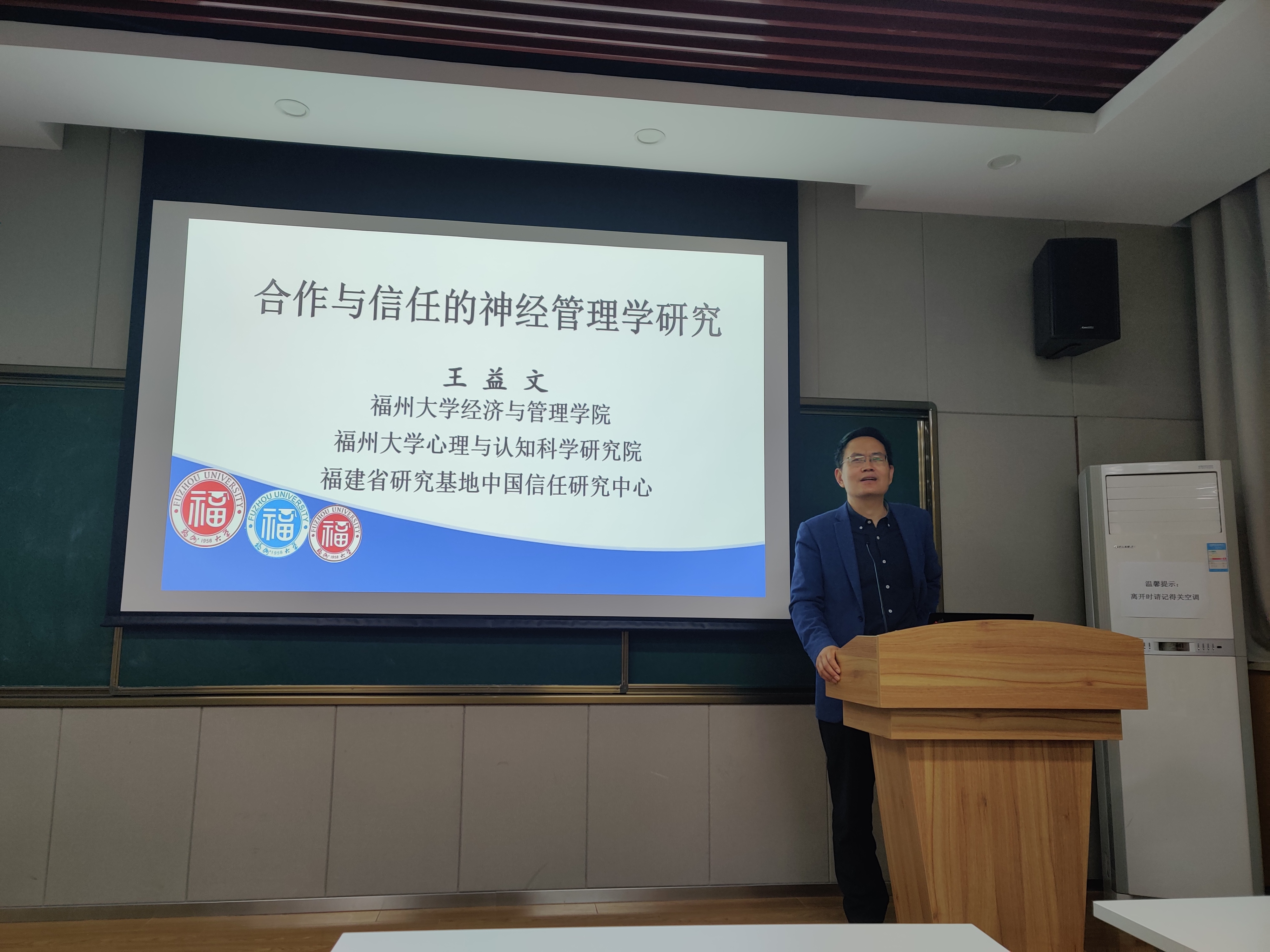 2019年11月29日下午,应管理学院邀请,福州大学经济与管理学院王益文教授在长安校区管理学院214教室做了题为“合作与信任的神经管理学研究”的学术报告。本次报告会由贾明教授主持,学院部分师生参加了此次报告会。
