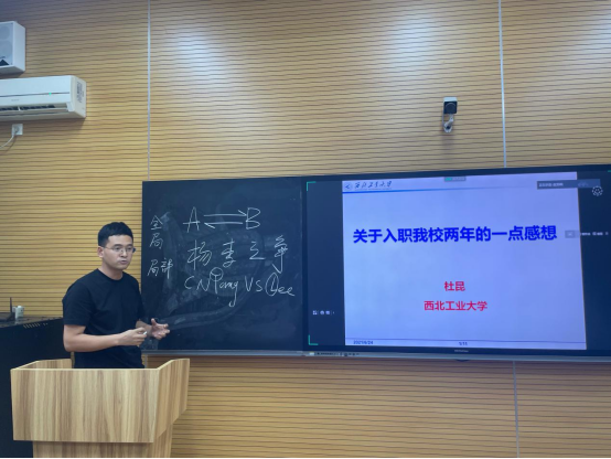 在接下来的沙龙活动中,动能学院杜昆助理就入校几年来自己的工作情况和心得体会进行了分享。杜昆助理首先回顾了自己入职西工大以来所取得的成果和遇到的问题进行了经验总结分享,他还特别提到在动能学院组织“冬青学会”的经历。通过冬青学会,动能学院将青年教师聚集到一起,相互帮扶、共同成长,在科研项目攻关、教学能力提升、国际合作拓展等方面集体出动、协同作战,取得了非常显著的成效。杜昆还提到,作为青年教师,在科研和学术上一定要主动出击,向国家重大战略、前沿科研问题,努力整合资源对关键科学问题进行攻关,如此方能在学术上有所建树。