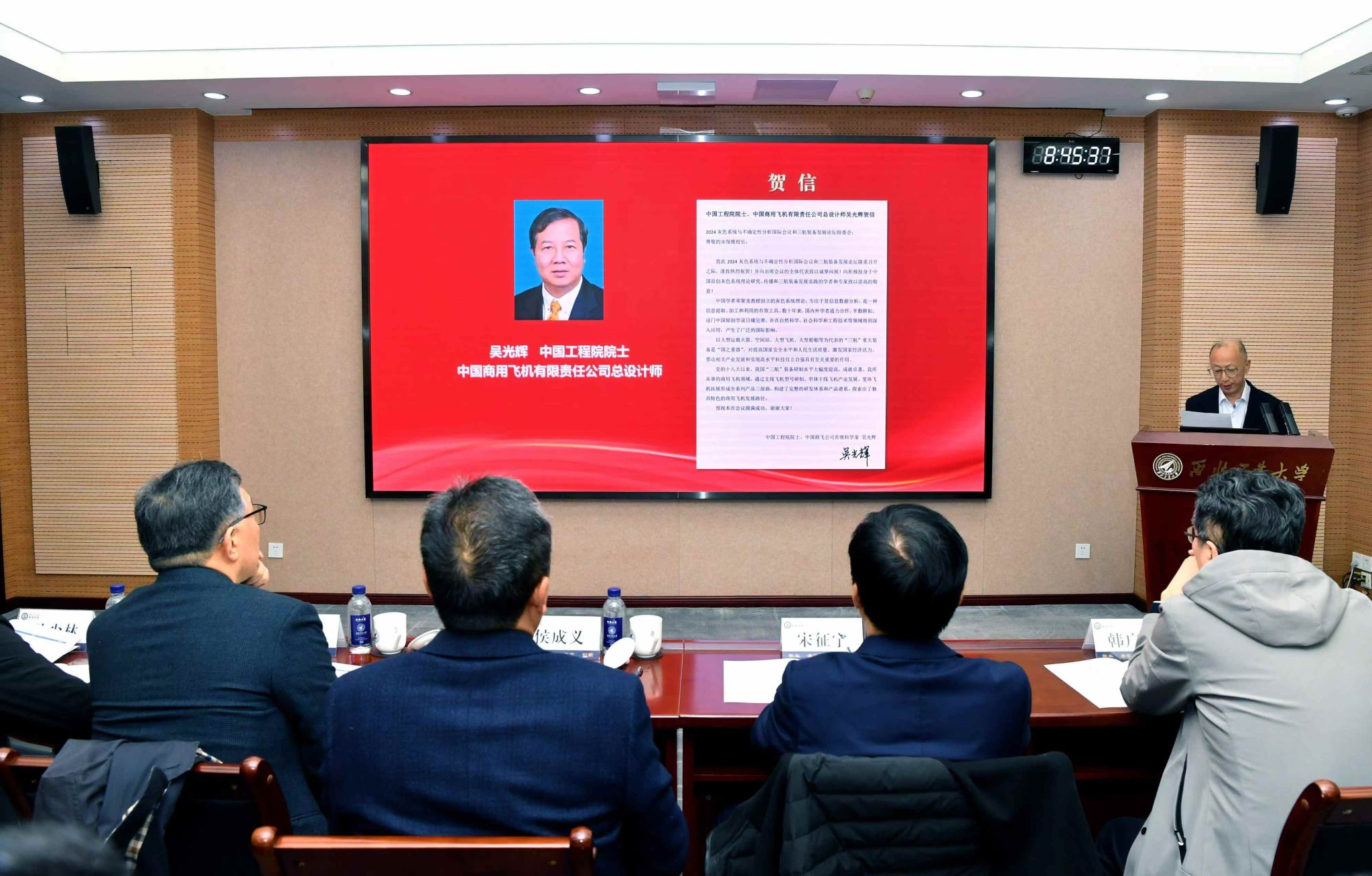中船海洋与防务装备股份有限公司董事宋德金宣读了中国工程院院士、中国商飞总工程师、C919大型客机总设计师吴光辉的贺信。国家级领军人才、灰色系统与不确定性分析国际联合会主席刘思峰教授致辞,表达了对大会顺利召开的祝贺及对各位到场嘉宾的诚挚感谢。