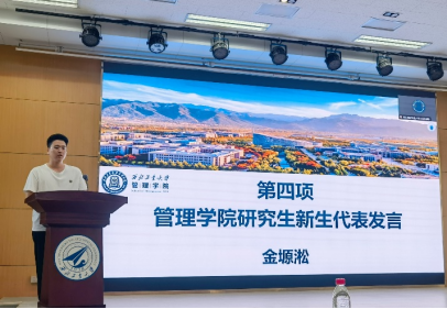 管理科学与工程系新生金塬淞代表研究生新生代表发言。作为本校学生升学的他,在本科阶段亲眼见证了学校、学院的发展壮大,深刻感悟到了西工大“公诚勇毅”校训的内涵。同时,他也被管理学院师生追求卓越的精神不断鼓舞,这也成为他今后学习、工作的内在动力源泉。