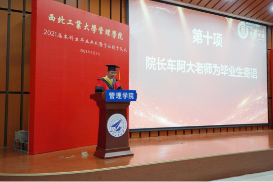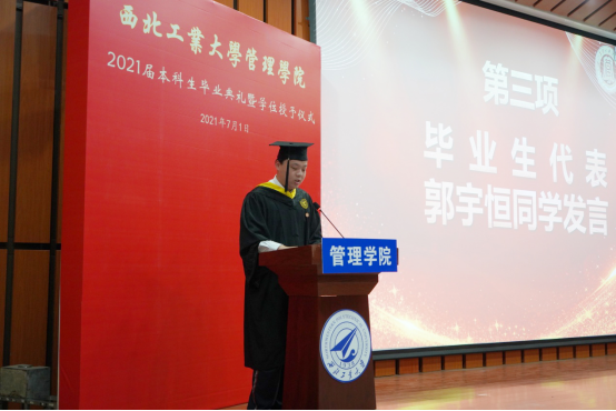 郭宇恒作为毕业生代表发言,他同大家一起回望了四载求学之路,并感谢学校及学院对自己的培养与栽培,他表示,离开学校后会继续身体力行,用实际行动践行身为西工大管院人所具有的时代责任与精神担当!