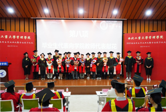 2021届毕业生代表向教职工代表献花,感谢他们四年来的辛勤付出与静心护航。