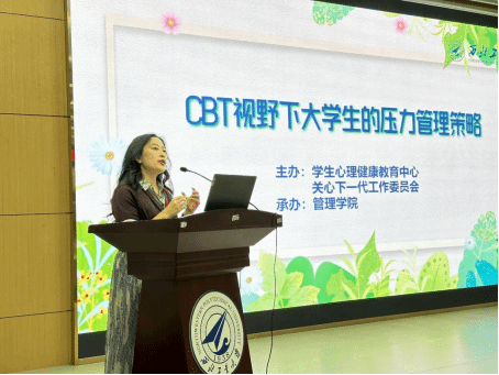 为全面提升学生的心理健康水平,更好地应对大学生活中的压力与挑战,4月23日晚上,成都理工大学心理健康教育中心刘荃副教授应邀在长安校区作了题为“CBT视野下大学生的压力管理策略”的报告会。本次报告会由学生心理健康教育中心、关心下一代工作委员会主办,由管理学院承办,旨在通过认知行为疗法(CBT)的视角,为在校学生提供科学有效的压力管理策略。离退休工作处副处长张琨、管理学院党委副书记王海啸、学生心理健康教育中心主任刘欣、离退休工作处郭芳辰、学生心理健康教育中心专职教师周晨琛和胡纯、管理学院辅导员郭利敏出席了报告会,150余名学生聆听了报告。报告会由郭利敏主持。