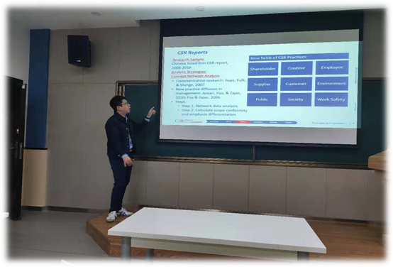 2019年10月22日上午,应管理学院张莹副教授邀请,上海科技大学创业与管理学院助理教授周小宇老师在长安校区管理学院214教室做了题为“Examining CSR Scope Conformity and Emphasis Differentiation among Chinese Publicly Listed Companies”的学术报告。报告会由张莹副教授主持,学院博士生及青年教师参加了此次报告会。
