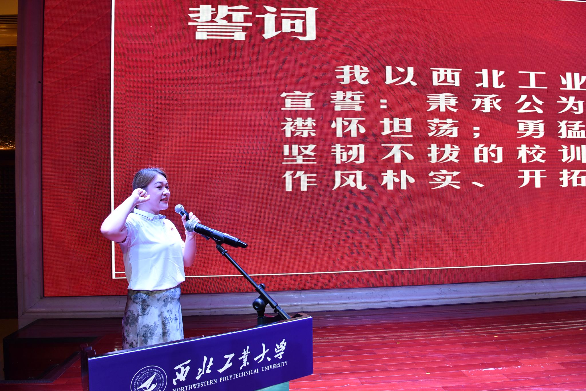 典礼上,学院党委书记张爽为新生代表佩戴西北工业大学校徽,MBA/MEM教育中心主任杨宏玲、MBA教育中心副主任肖平、MBA/MEM/MPAcc教育中心副主任黄媛为各位新生代表授予班旗。