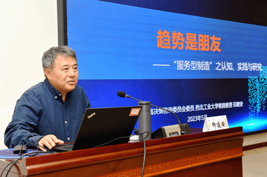 开班、结业仪式结束后,特邀陕西鼓风机(集团)有限公司原董事长、西北工业大学管理学院讲座教授印建安作了题为《趋势是朋友——“服务型制造”之认知、实践与研究》的专题报告。