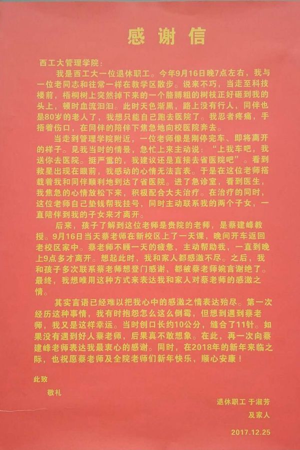 2017年9月16日晚退休职工于淑芳老人在校园散步时被掉落的树枝砸伤,头部出血。慌乱中急赴医院救治。途中,管理学院蔡建峰教授路遇,主动驾车送于淑芳老人去省医院就诊。到医院后,垫钱挂号帮助于淑芳老人就诊,并联系其子女,直到她的子女到达医院蔡老师才离开。后于淑芳老人及其家人多次想登门感谢被蔡建峰教授婉拒,于是写下这封温暖的感谢信。作为一名教师,蔡建峰教授学识渊博、教书育人;作为一名党员,心怀大爱,热心帮助他人。可谓一言一行,为人师表。这种助人为乐的精神,让人感动,更值得大家学习。