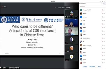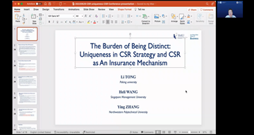 6月29日上午,由贾明教授主持开幕式。他提到,这次是我校举办的第三届企业社会责任研讨会,对于促进学者们在CSR研究上的交流,更好推动CSR和ESG方向的前沿研究具有重要作用。接下来进行了上半场主题报告,新加坡管理大学李光前商学院(SMU,Lee Kong Chian School of Business)的Prof. Heli Wang分享了企业社会责任战略的独特性在其作为保险作用方面的最新研究。