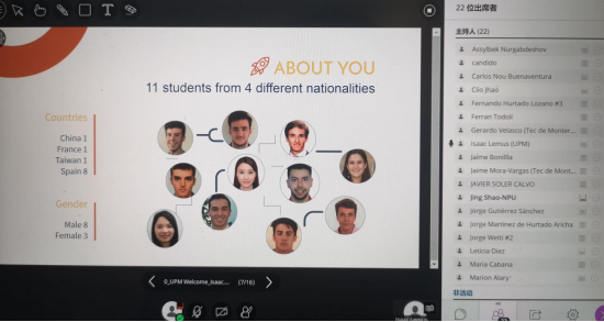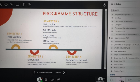 The second part of the meeting is the Kick-off of IMIM program. Students enrolled in 2020 were invited to attend the meeting and each of them had several minutes to do a self-introduction to all attendants of the meeting. Also by this chance that 11 students of 2020IMIMeditioncould know each other. Then,representatives ofeach university were invited to have a presentation oftheirinstitution. Prof. Shao Jing,Assistant Dean of School of Management, as representative of NPU,briefly introducesthe universityand School of management, with content ofthe geographical location, historical evolution, research direction, faculty, research platform and partners, andalso the courses and living facilities inthe school. At the end of the questions and answers session, the representatives ofeach institution answered thestudents’ questions.
